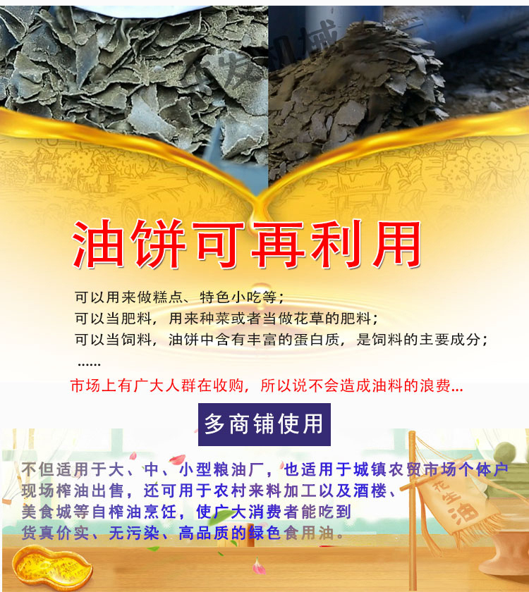 油机都是一机多用的,已经不是传统的之可以压榨一种油料了。乐发榨油机可以压榨花生、大豆、芝麻、菜籽,棉籽、植物等20多种的油料,实现一机多用,为投资者带来更多的利益。