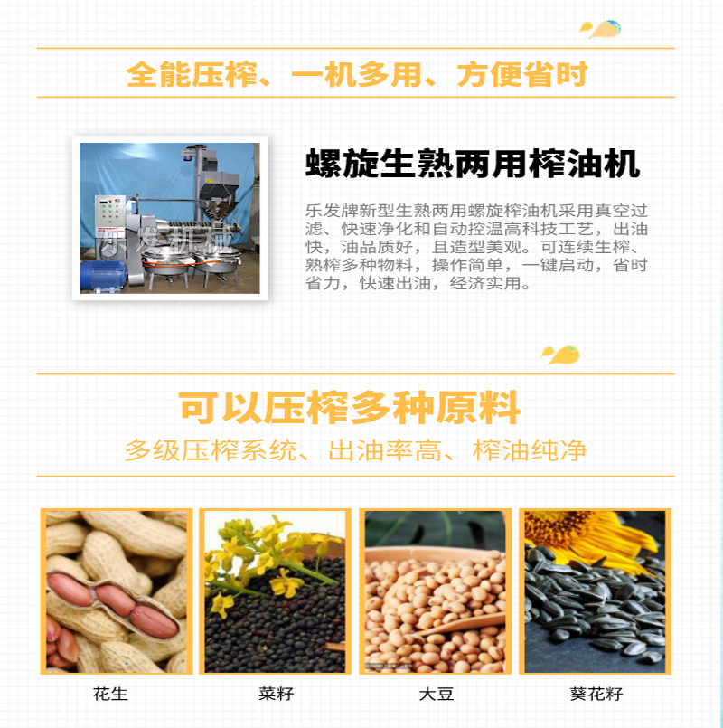 有很多用户在购买榨油机时不知怎么选择,很纠结,其实做为榨油机生产厂家我要为客户分享的是,选购时要具体看您榨什么物料,比如是:榨花生、菜籽、大豆还是芝麻?