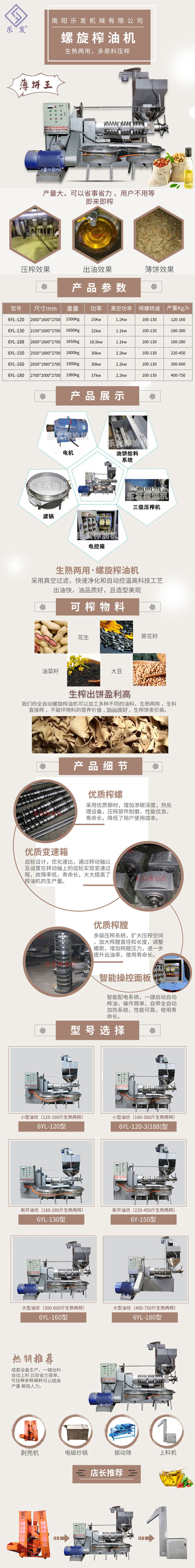 确定好物料后,然后选择榨油机厂家,目前榨油机的生产技术已经非常成熟,大家只要认准正规的生产厂家,售后服务有保障的都是可以的,乐发牌榨油机专注榨油机行业20余年,凭借技术精良、完善的服务及优良的口碑传播占领国内市场,已出口产品国内外全球,主要生产螺旋榨油机,液压榨油机,各种相关榨油机配件产品。经过20多年的辛勤探索,南阳乐发建立了一套完备有效的服务体系,打造了一支经验丰富的服务团队,为客户提供技术培训,而且派技术人员现场指导安装和调试设备。我司二十余载的拼搏与奋斗,成就了井然有序、开拓进取的"乐发"牌,也走出了一条高新产品、经济效益与环境保护可持续发展的乐发"特色之路,乐发粮油机械愿以更新的技术,更高的质量,更好地服务广大新老用户,真诚合作,再创辉煌!